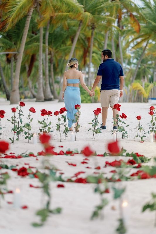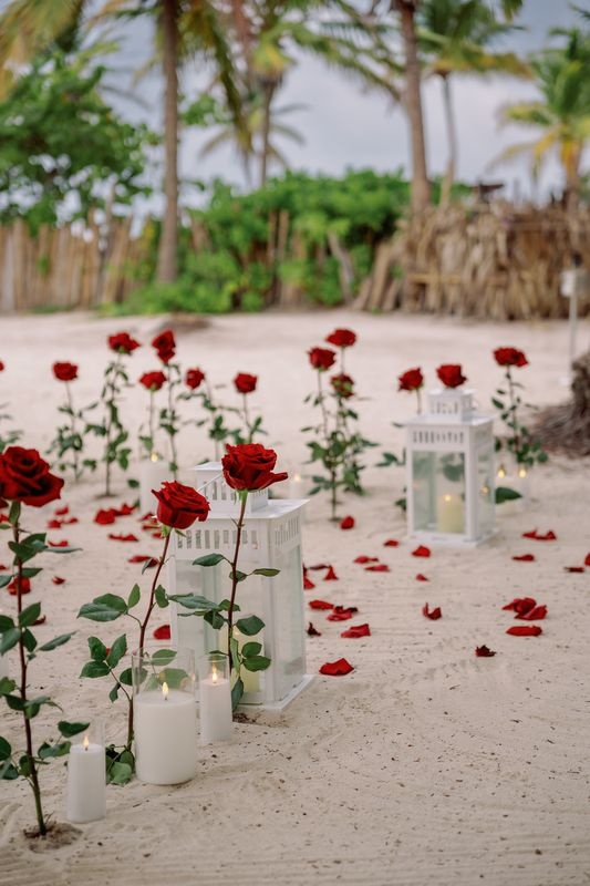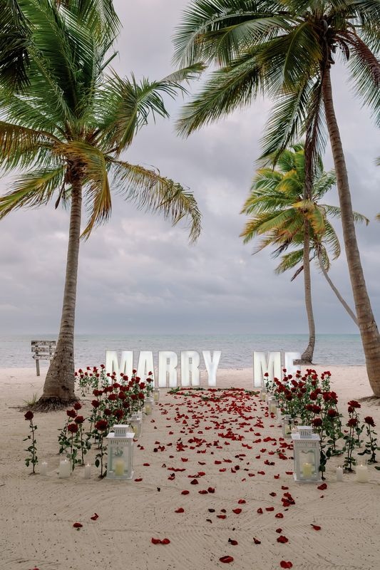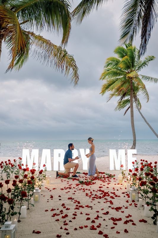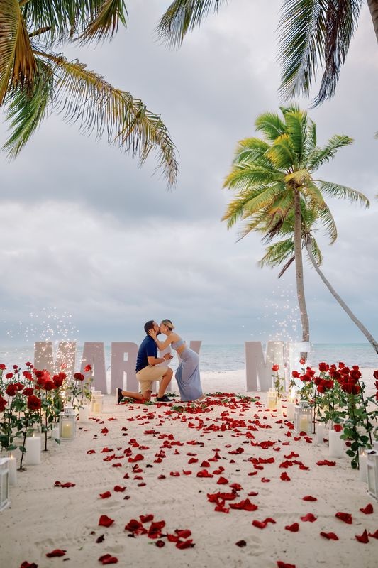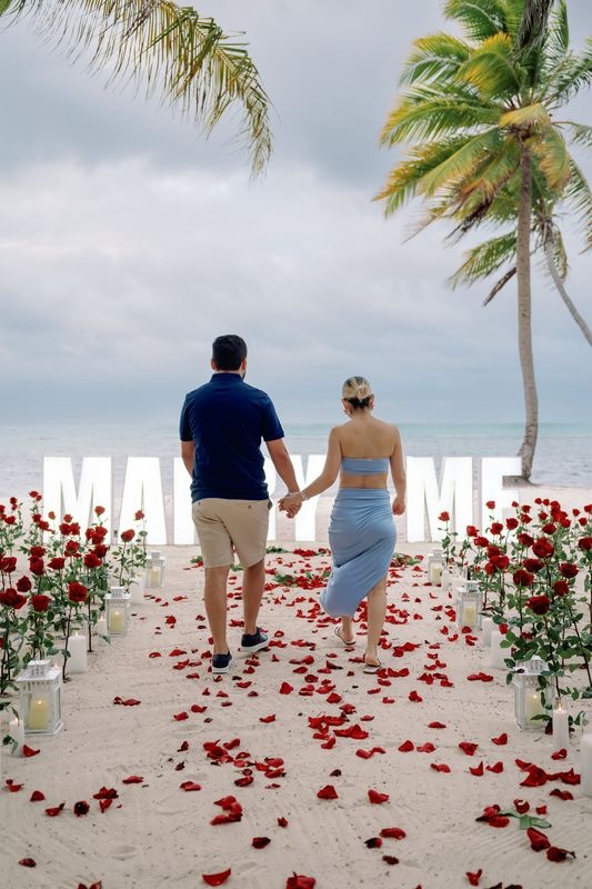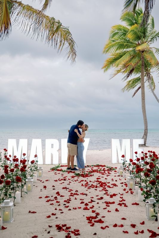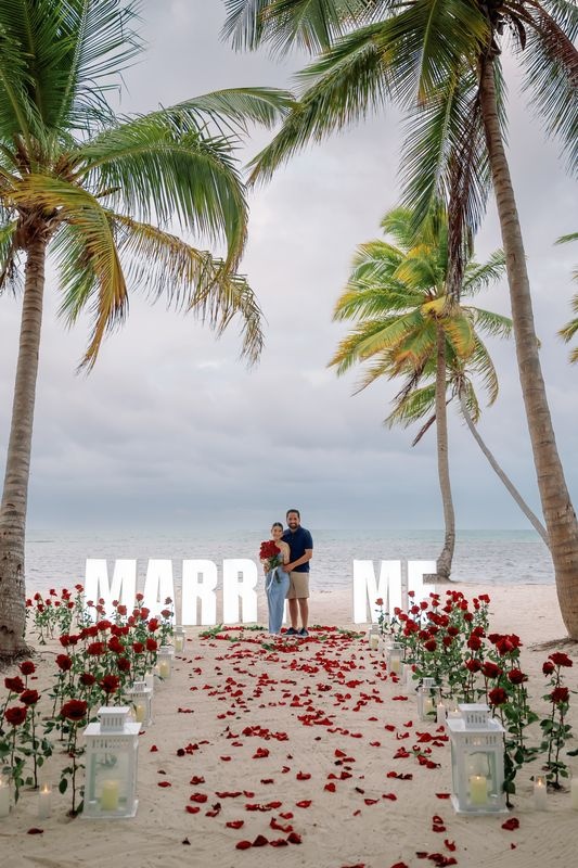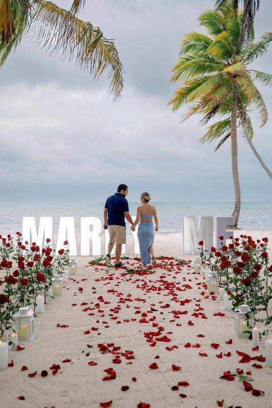 Ein Weg aus Rosenblättern zog sich über den weißen Sand und führte sie direkt zu leuchtenden Buchstaben, die „Marry Me“ bildeten. Um die Buchstaben herum schufen Dutzende von Rosen eine herzliche Atmosphäre. Darüber hinaus machte die karibische Kulisse den Moment noch magischer.