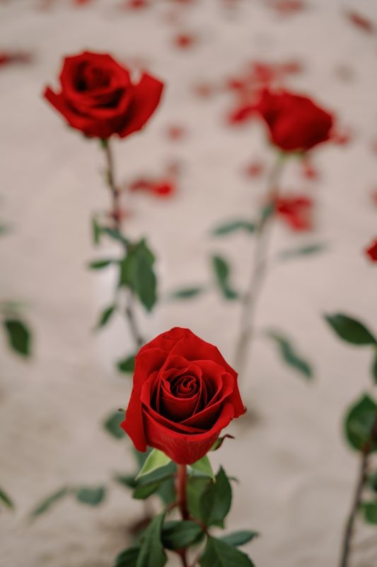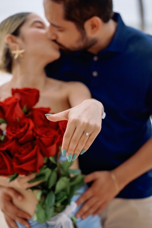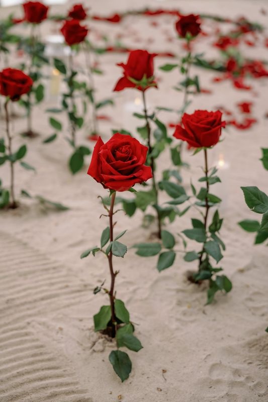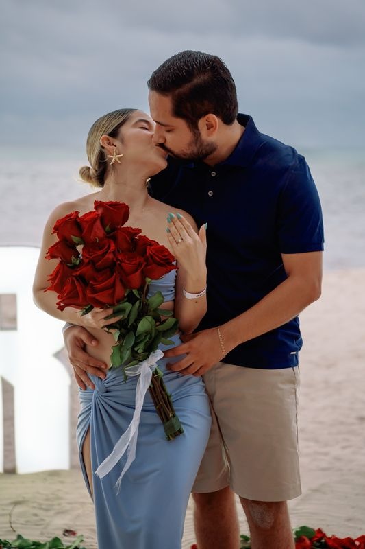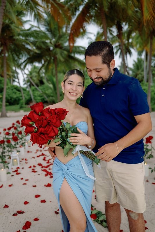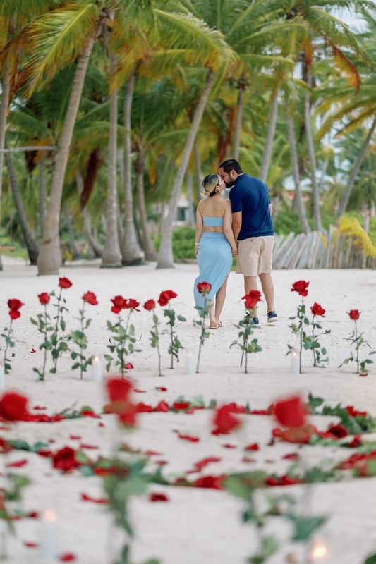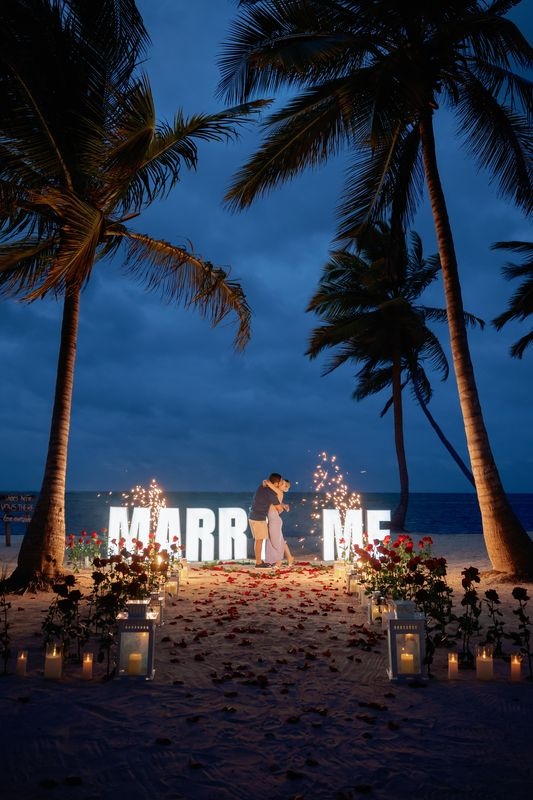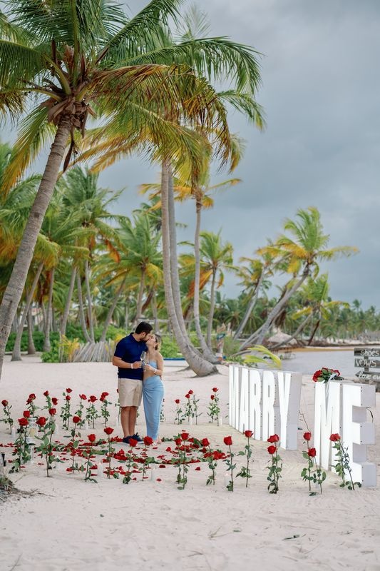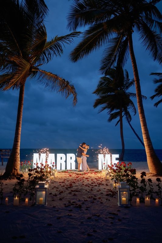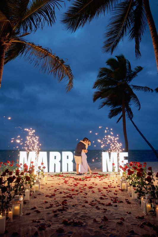 Ein Weg aus Rosenblättern zog sich über den weißen Sand und führte sie direkt zu leuchtenden Buchstaben, die „Marry Me“ bildeten. Um die Buchstaben herum schufen Dutzende von Rosen eine herzliche Atmosphäre. Darüber hinaus machte die karibische Kulisse den Moment noch magischer.