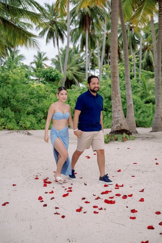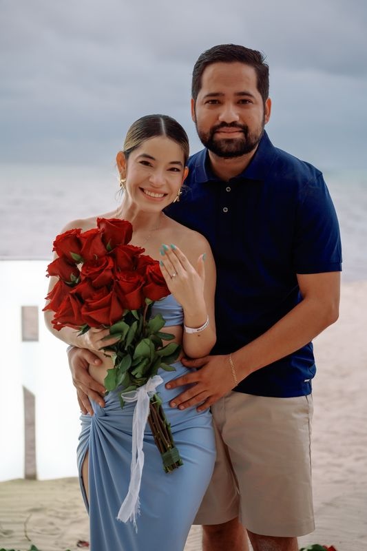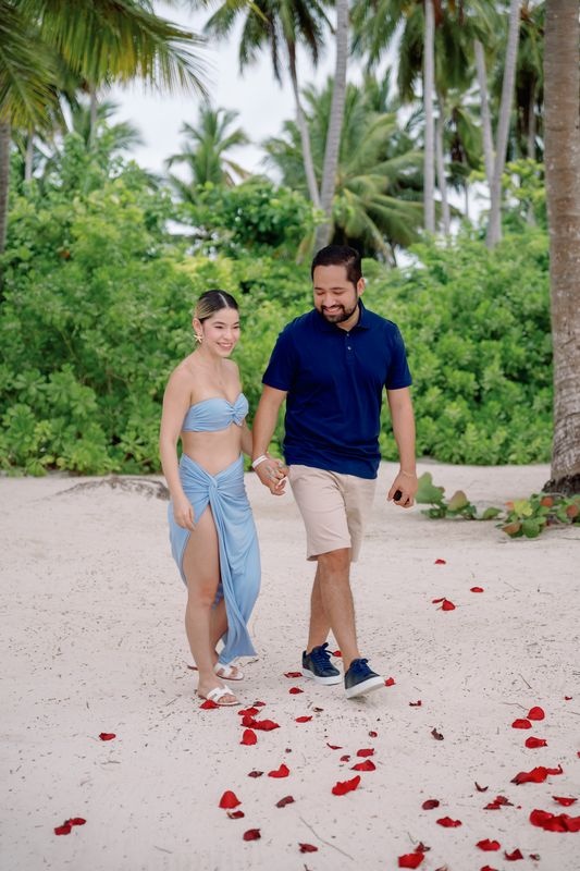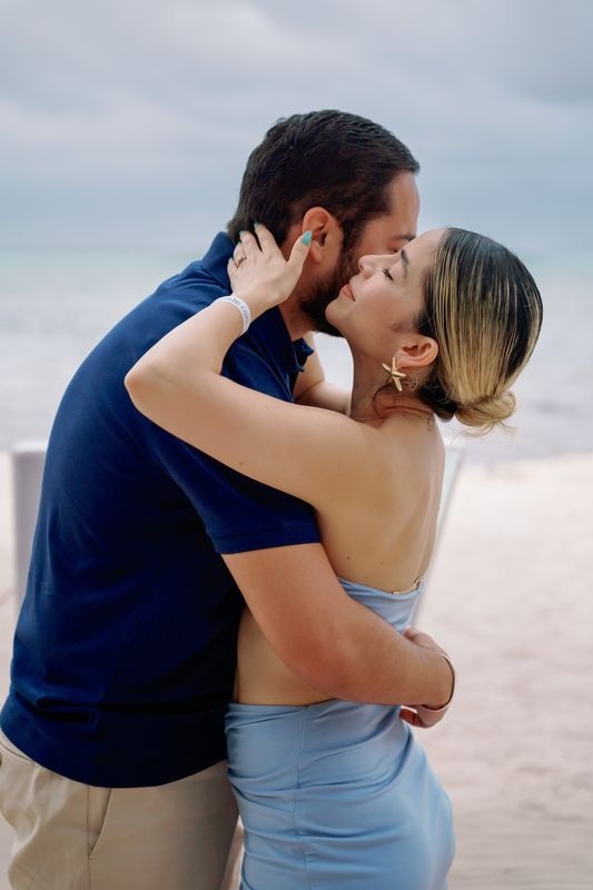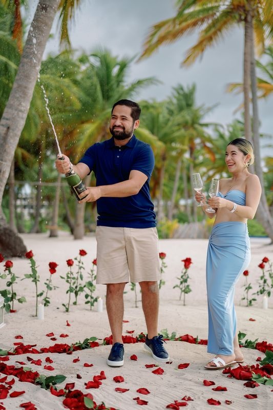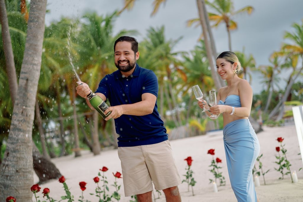Mit Champagner in der Hand feierten Daniel und Karen ihre Liebe, während die Sonne hinter dem Horizont verschwand. Gleichzeitig berührten die Wellen sanft das Ufer und erzeugten eine natürliche Melodie für ihr Glück. Nach dem Antrag genossen sie einen romantischen Spaziergang am Strand. Durch die Rosenblätter im Sand erinnerte jeder Schritt an das Versprechen, das sie gerade gegeben hatten.