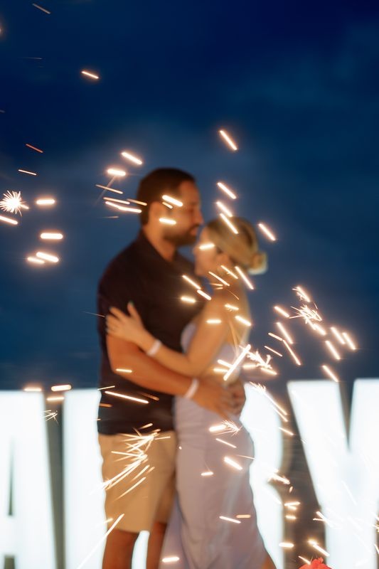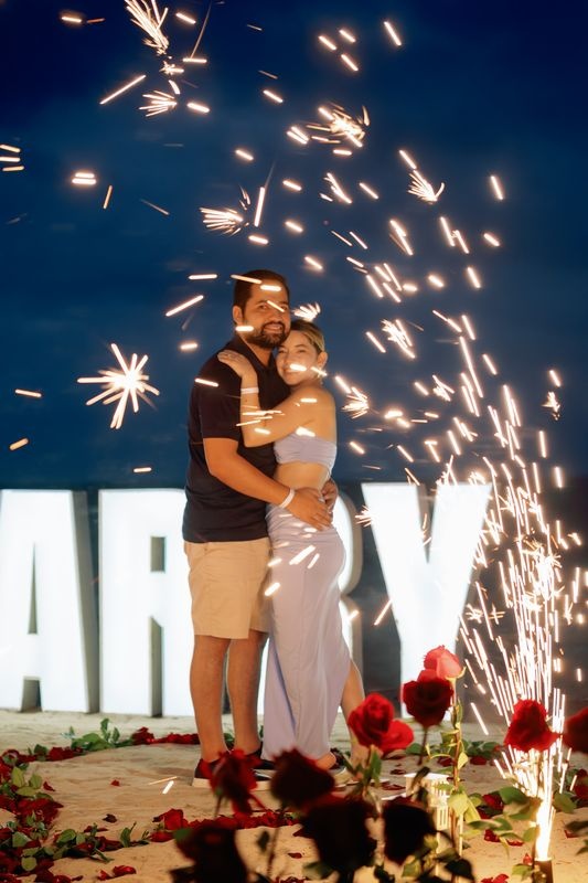 Als Karen näher kam, erhellten funkelnde Feuerwerksfontänen den Himmel. Daher wirkte der Antrag noch bezaubernder und umhüllte das Paar mit goldenem Licht und unvergesslicher Energie. Danach kniete Daniel nieder und stellte die wichtigste Frage ihres Lebens. Es war ein einmaliges Erlebnis, geschaffen mit Leidenschaft und Liebe zum Detail.