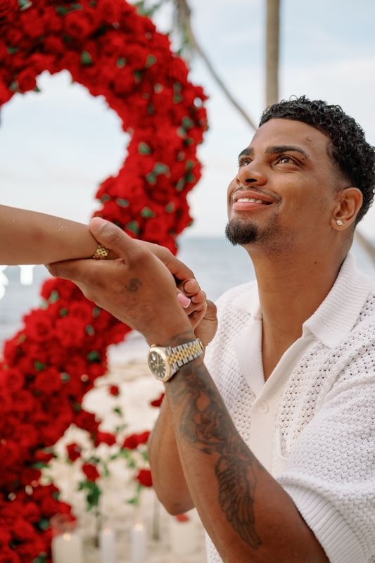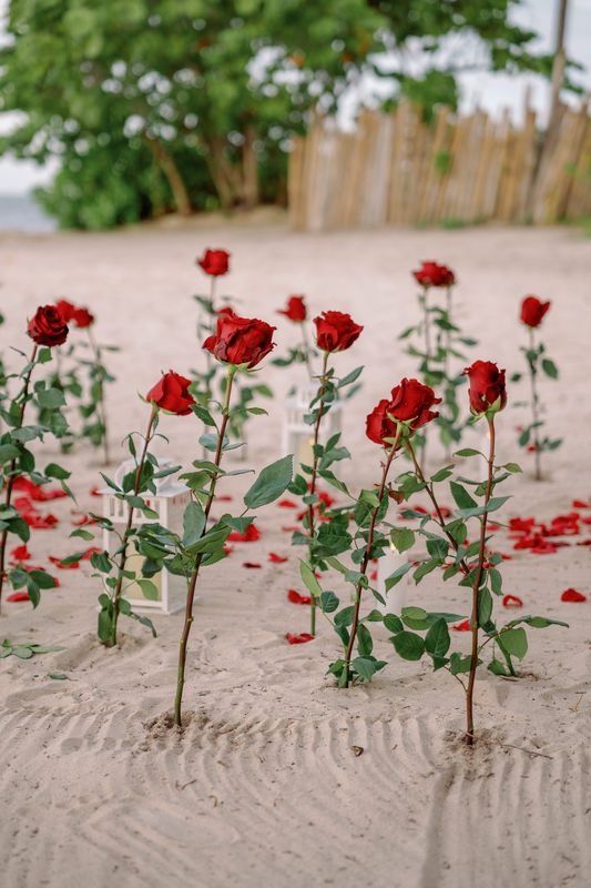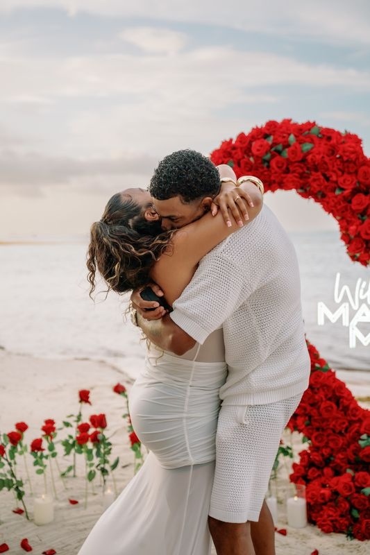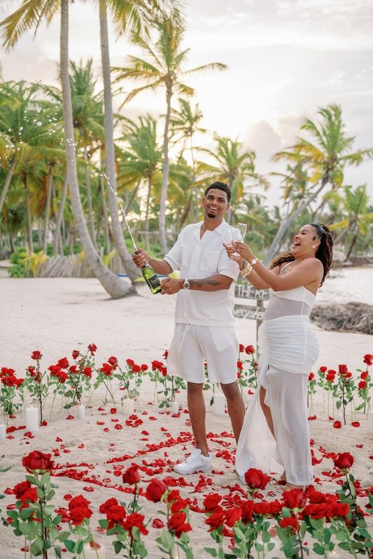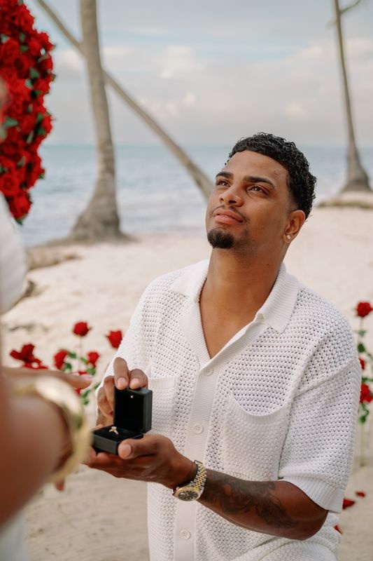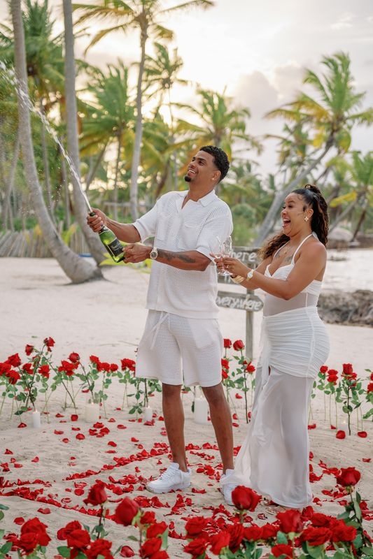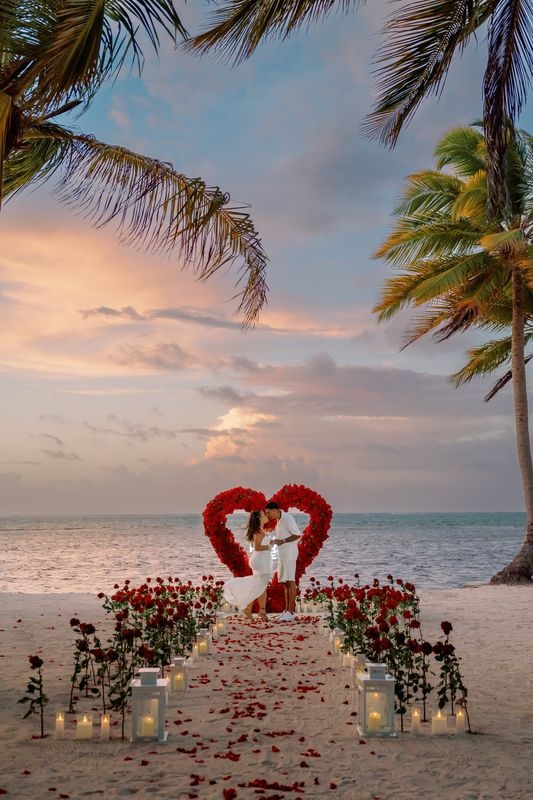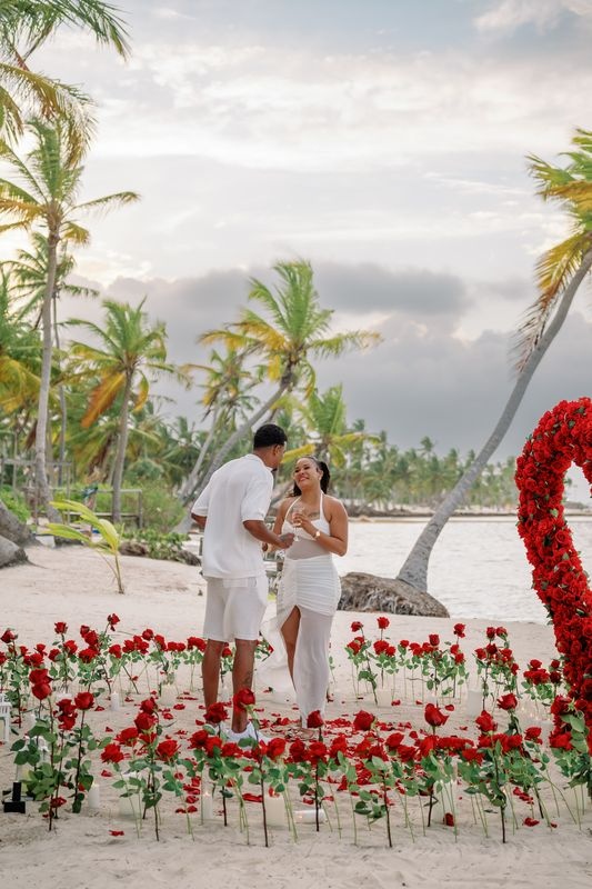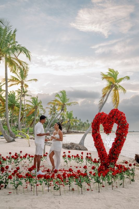 Auf dem weichen, weißen Sand leuchtete ein Schild mit der Aufschrift „Will You Marry Me?“ hell in der Mitte eines riesigen Herzens aus frischen roten Rosen. Umhergestreute Blütenblätter vervollständigten die romantische Dekoration, während der warme karibische Sonnenuntergang die perfekte Kulisse für diesen unvergesslichen Heiratsantrag in Punta Cana bildete. Für reisefreudige Besucher, die mehr über die Region erfahren möchten, lesen Sie mehr über Punta Cana.