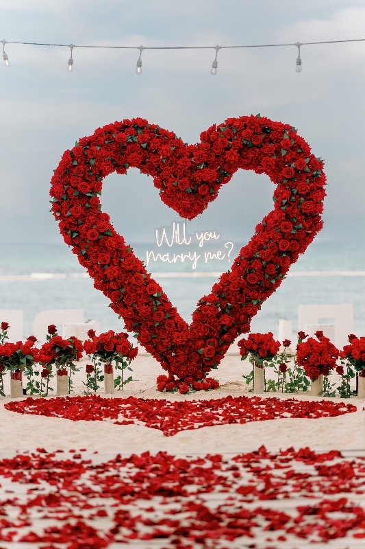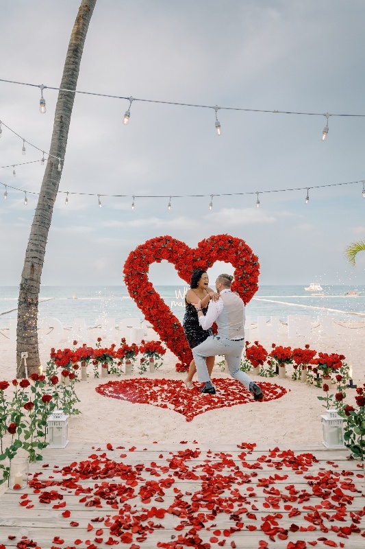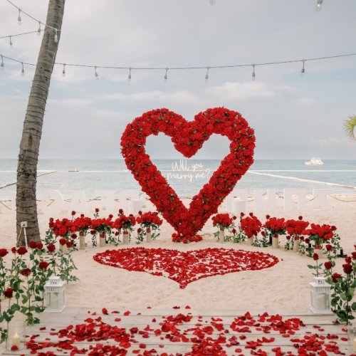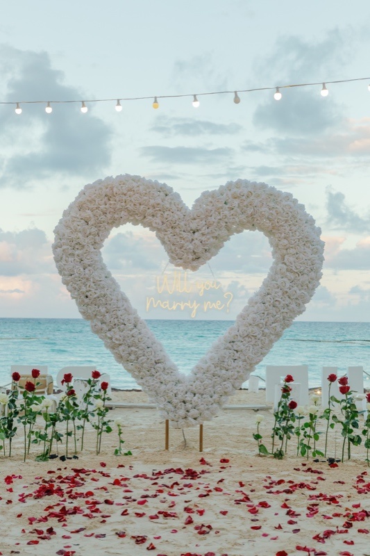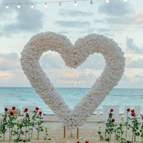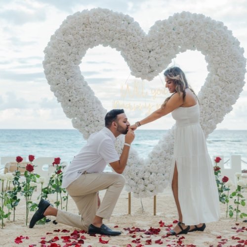 Im malerischen Paradies von Punta Cana, Dominikanische Republik, entfaltet sich ein Heiratsantrag unter dem bezaubernden Herzbogen aus weißen Rosen. Vor der tropischen Kulisse symbolisiert dieses kunstvoll gestaltete Blumendekor Reinheit und zeitlose Verbundenheit. Der herzförmige Bogen, geschmückt mit makellosen weißen Rosen, wird zum atemberaubenden Mittelpunkt und verbindet die natürliche Schönheit von Punta Cana mit der Eleganz einer romantischen Geste.