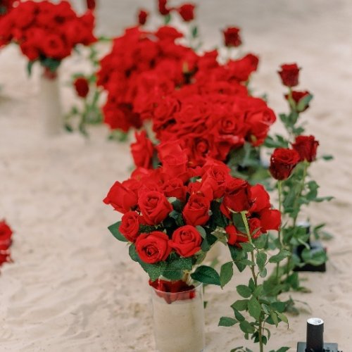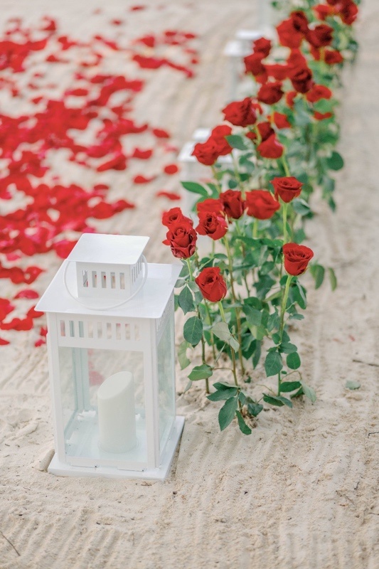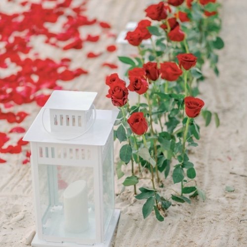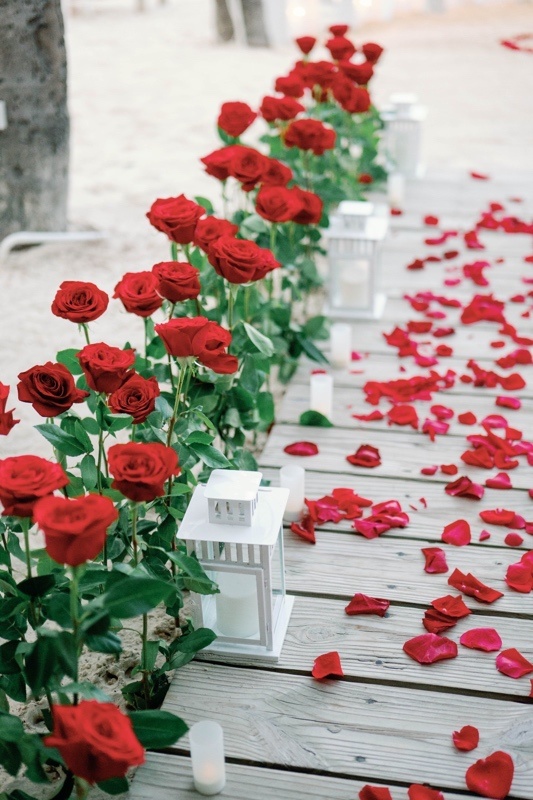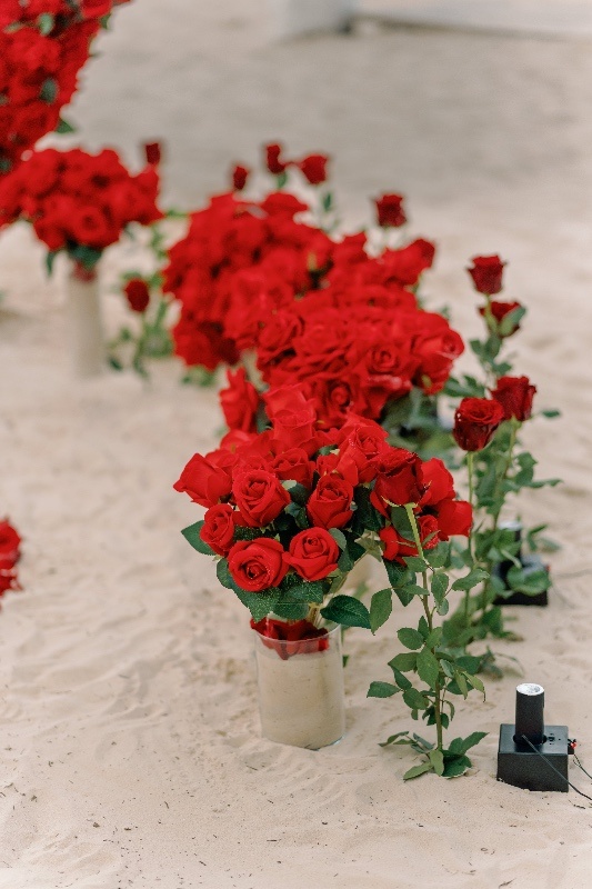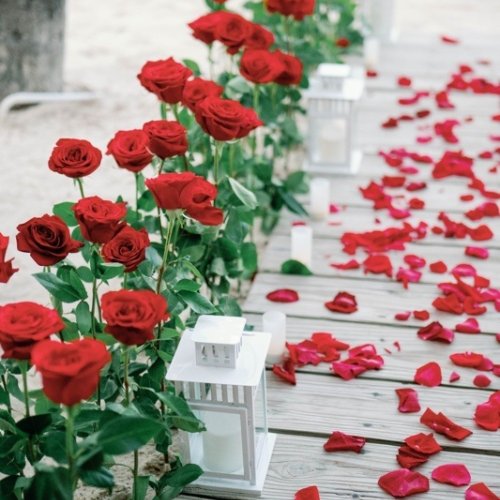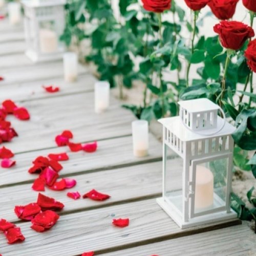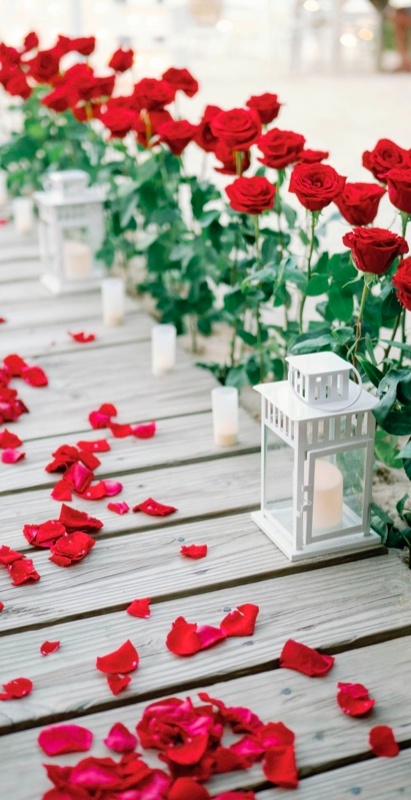 - Kerzenbeleuchteter dekorierter Bereich, schöner Herzbogen aus weißen oder roten Rosen (Seidenblumen), rote oder weiße Rosen am Weg (Mischung aus künstlichen und frischen Rosen)