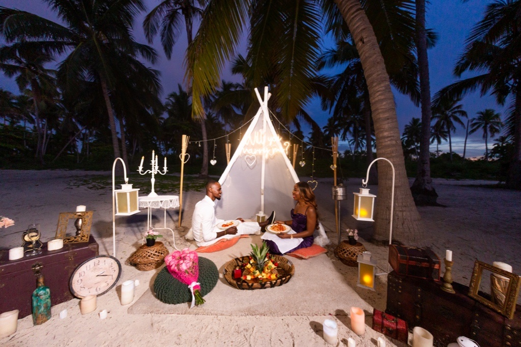 Frische Blumen (12 Rosen oder tropische Blumen) – $80, romantisches komplettes Abendessen oder Mittagessen inkl. Tische und Stühle – $450, Bambuscanopy mit Stoff – $450.
