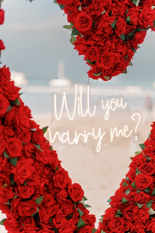 - LED „Willst du mich heiraten?“-Schild auf der Spitze des Bogens