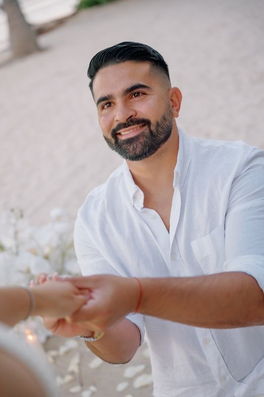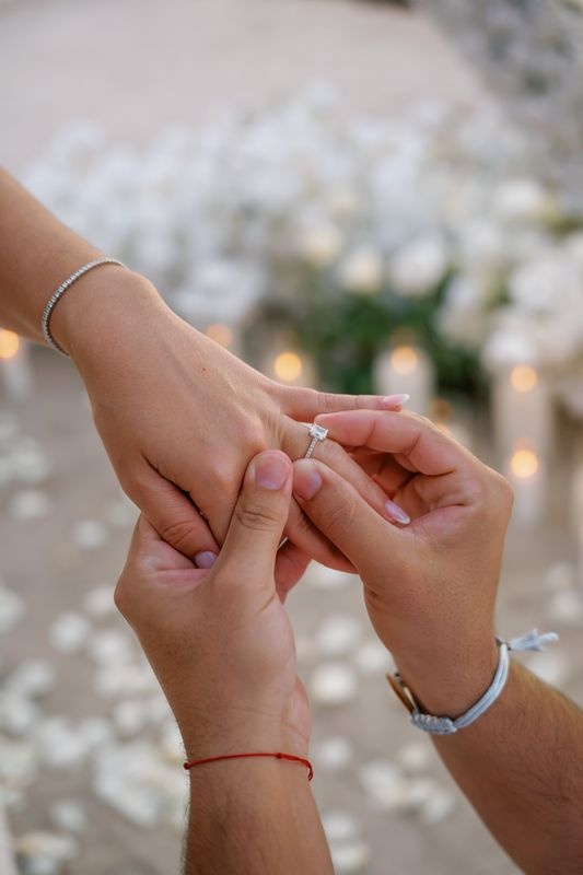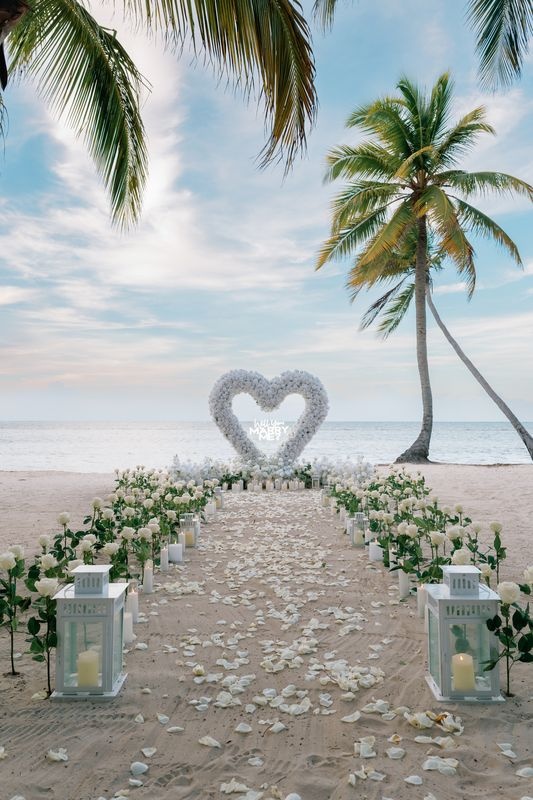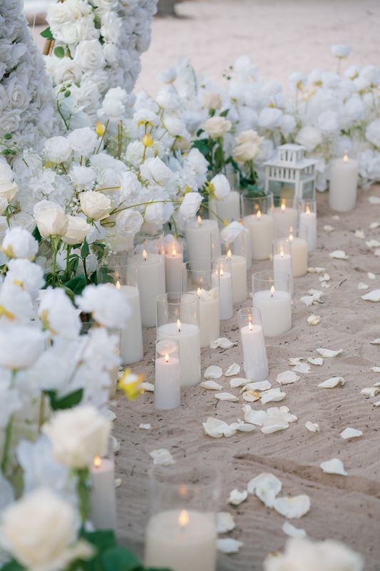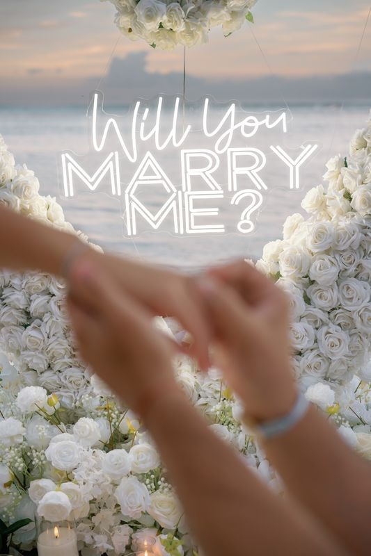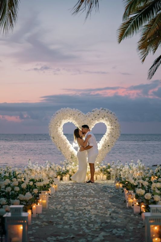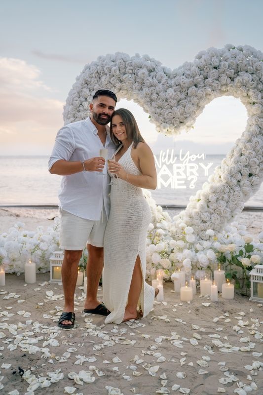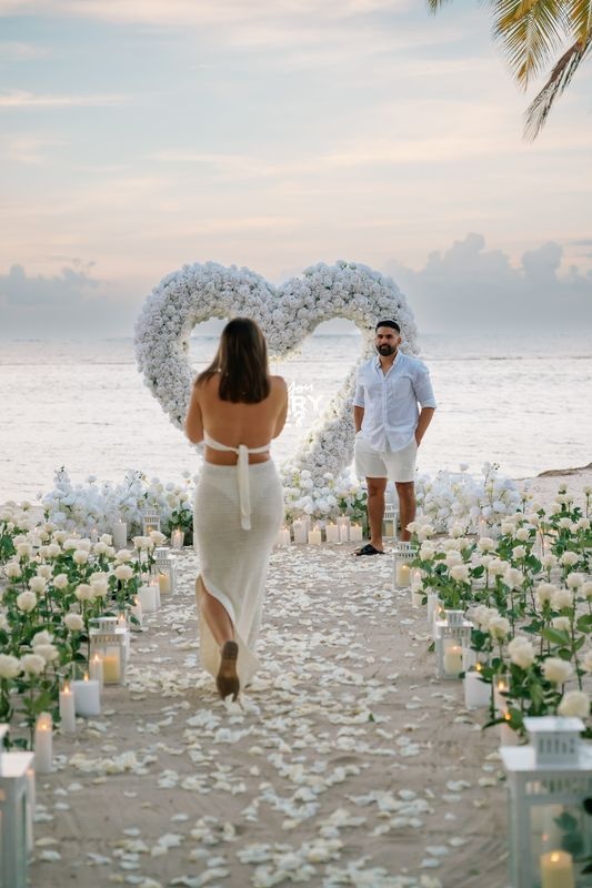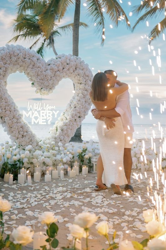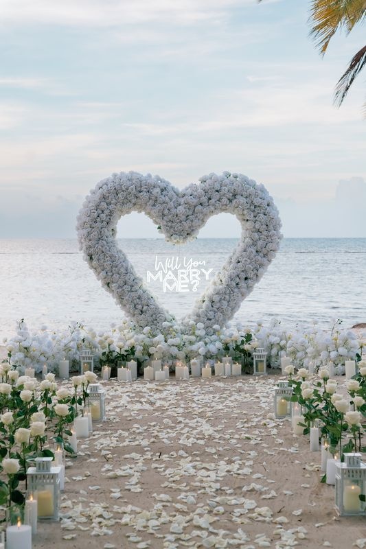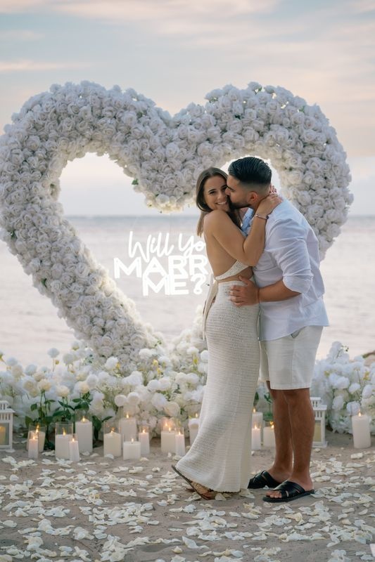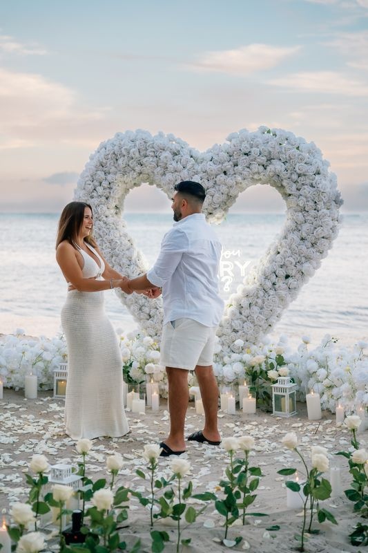 Dieser Antrag begann mit einem jungen Paar, das an einem versteckten Strand ankam. Die zukünftige Braut dachte, es sei nur ein romantischer Spaziergang. Doch als sie den weichen Sand betrat, sah sie eine atemberaubende Szene. Ein riesiges Herz aus weißen Rosen stand im Sand, in dessen Mitte leuchtende Worte erschienen: „WILL YOU MARRY ME?“. Ein Weg aus Rosenblättern führte zu dem Herzen, gesäumt von Kerzen und eleganten weißen Rosen an den Seiten.
