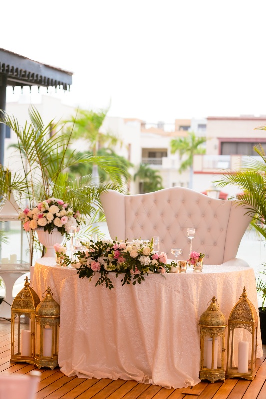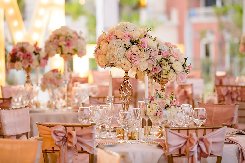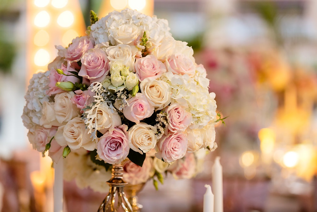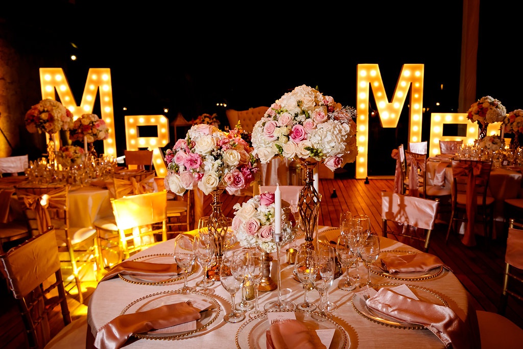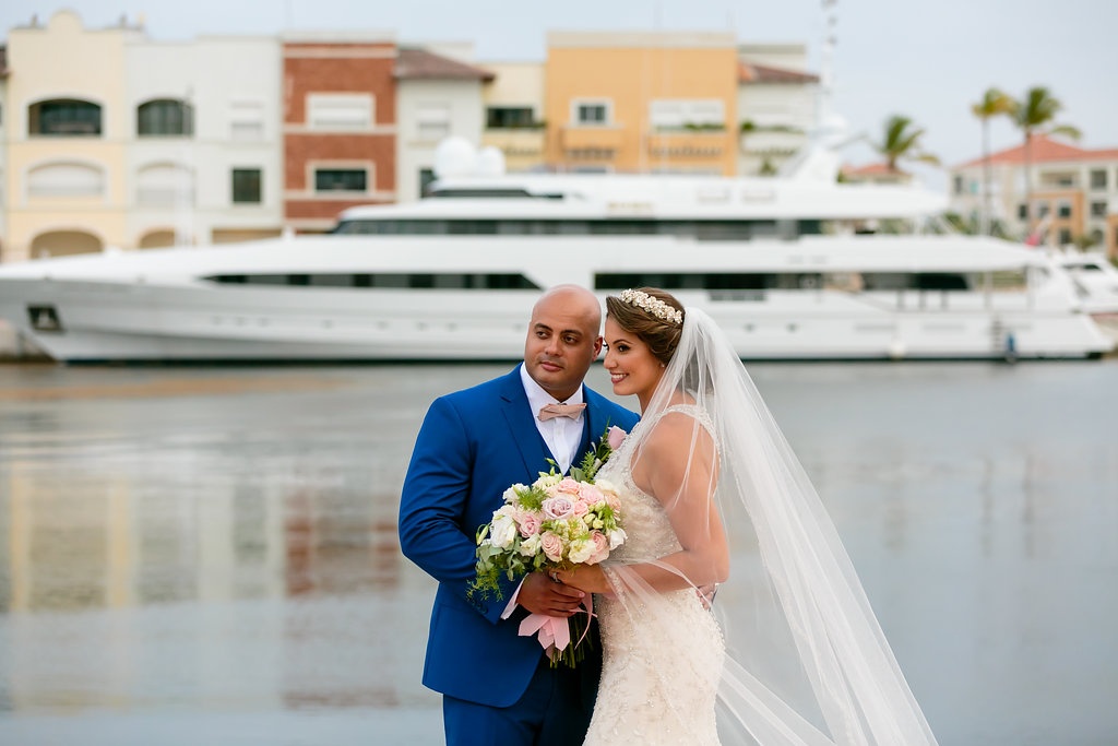 Der Empfang und das Showprogramm fanden in einem beeindruckenden Club mit wunderschönem Blick auf den Hafen von Cap Cana statt. Goldene und pudrige Akzente in der Dekoration unterstrichen perfekt die Zartheit der floralen Kompositionen, an denen das Floristenteam gearbeitet hatte.