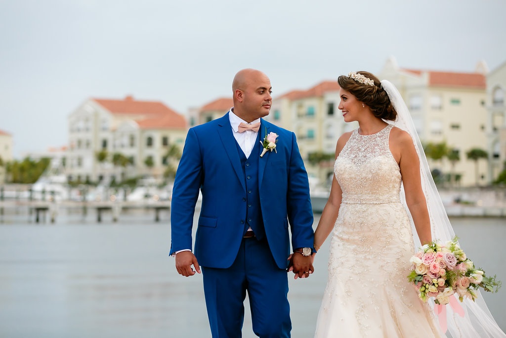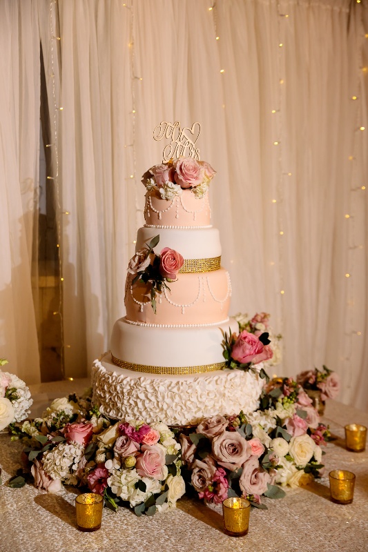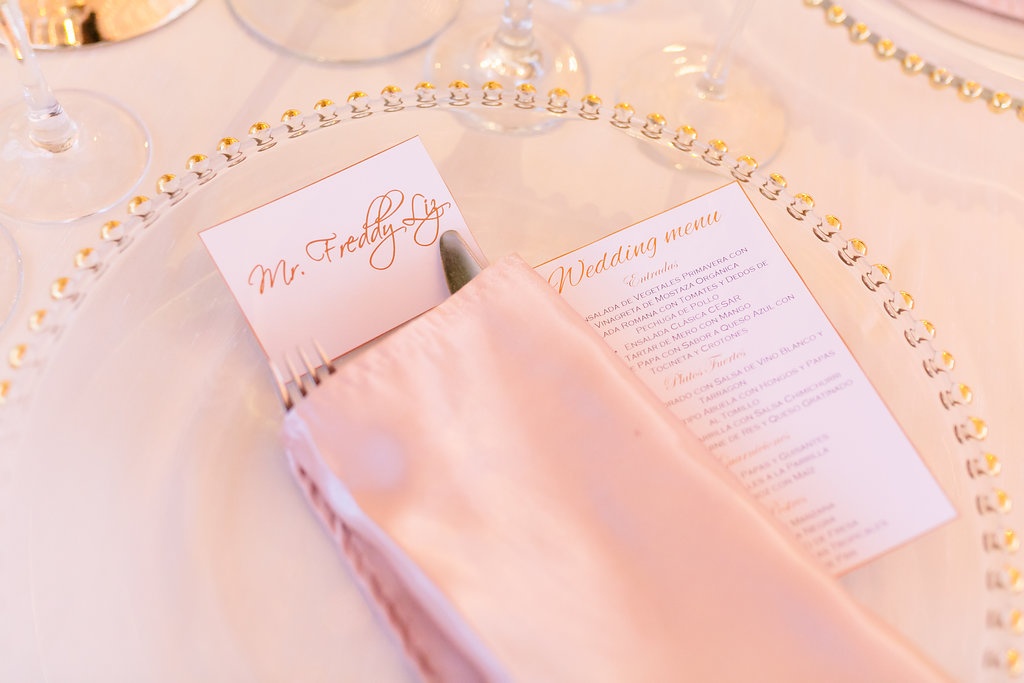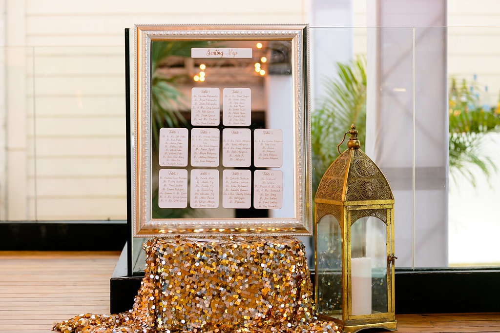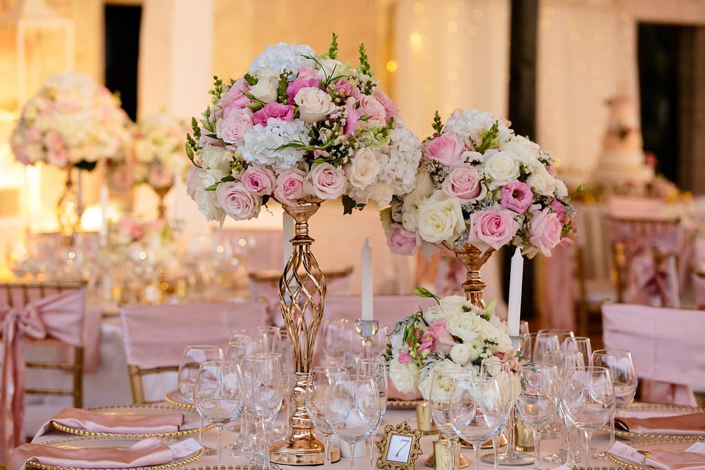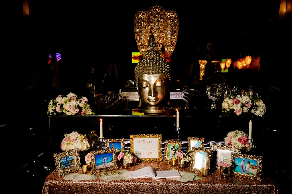 Der Empfang und das Showprogramm fanden in einem beeindruckenden Club mit wunderschönem Blick auf den Hafen von Cap Cana statt. Goldene und pudrige Akzente in der Dekoration unterstrichen perfekt die Zartheit der floralen Kompositionen, an denen das Floristenteam gearbeitet hatte.