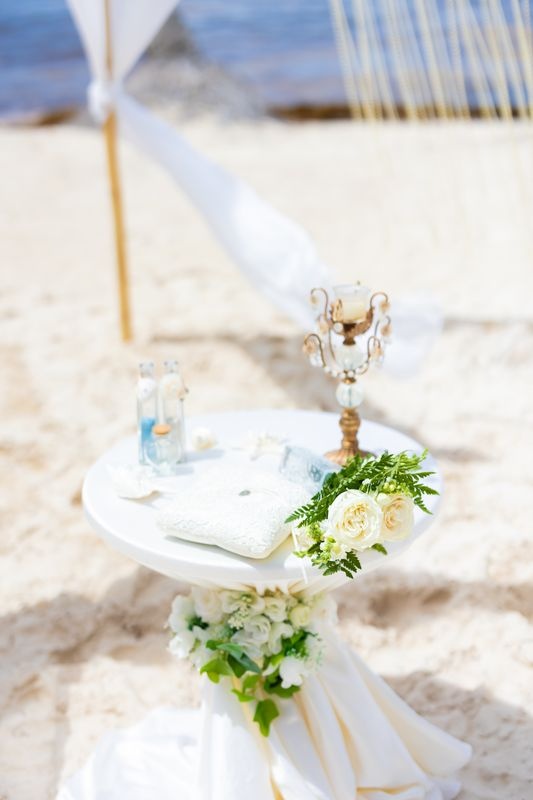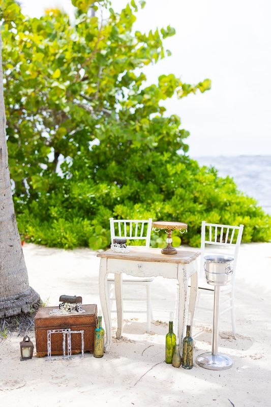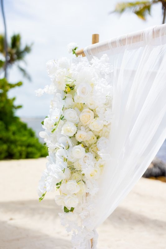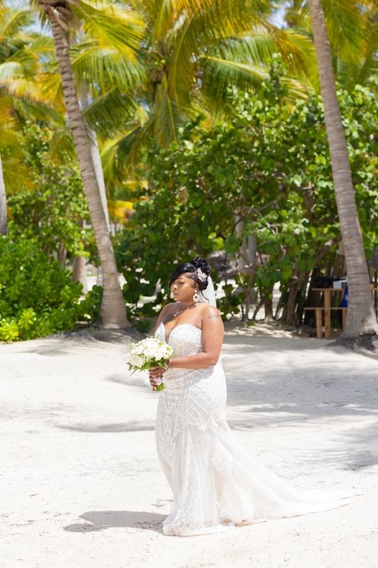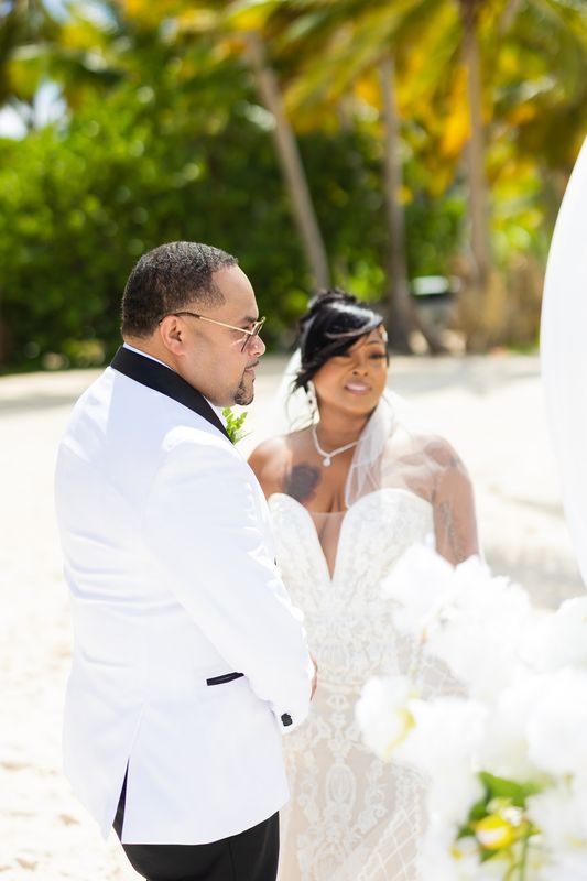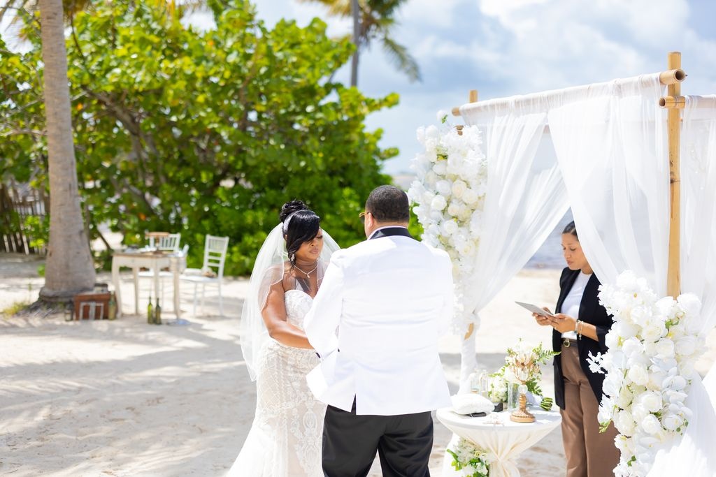 Palmen rahmten die Szenerie ein, während ein weißer Stoffbogen mit zarten weißen Blumen vor dem türkisfarbenen Karibischen Meer stand.