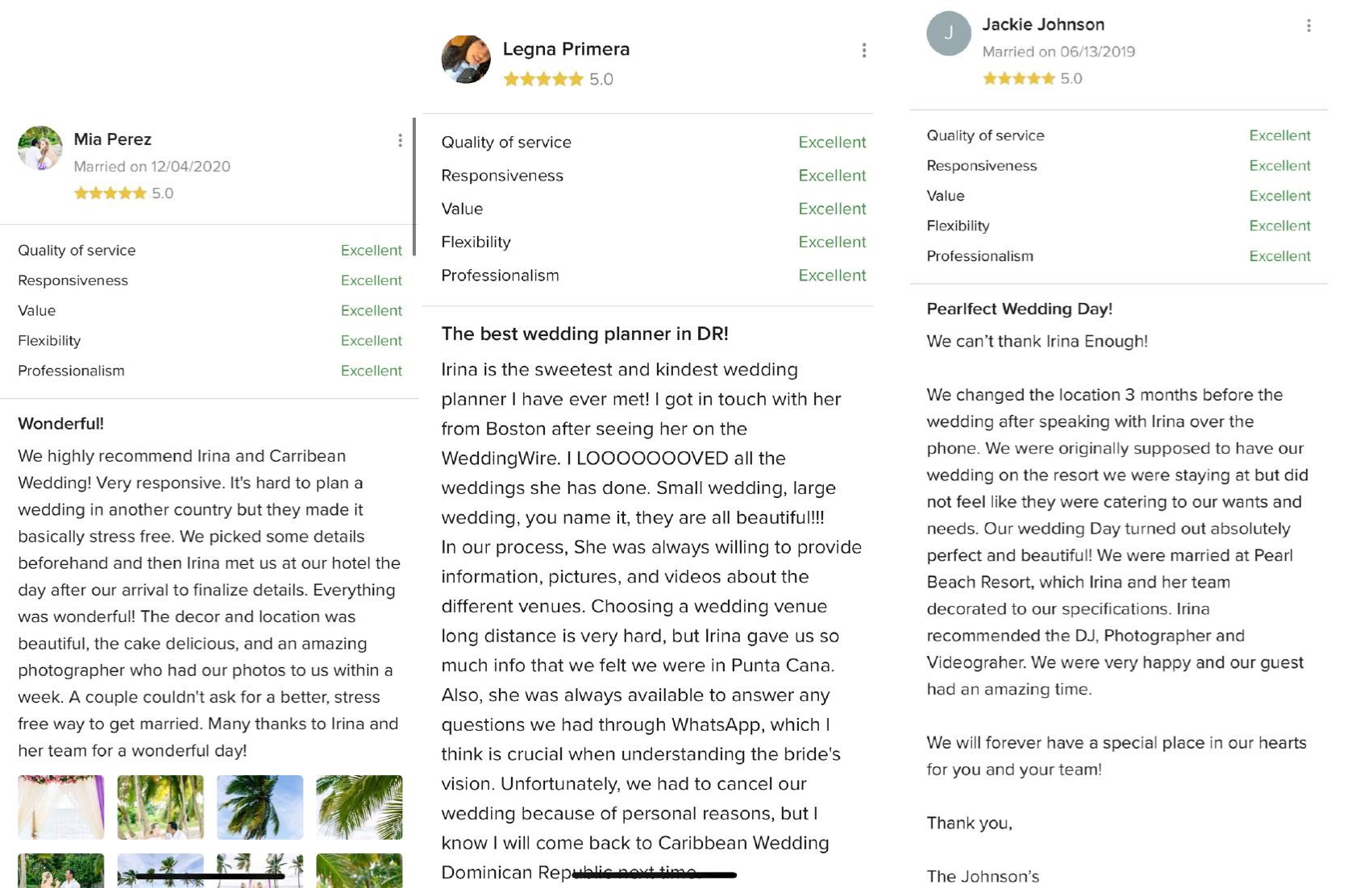 Laut Theknot.com und Weddingwire.com ist Caribbean Wedding Agency seit 2014 bis 2025 die beste Hochzeitsagentur und Irina die beste Hochzeitsplanerin der Dominikanischen Republik. Derzeit haben wir 335 5-Sterne-Bewertungen.
