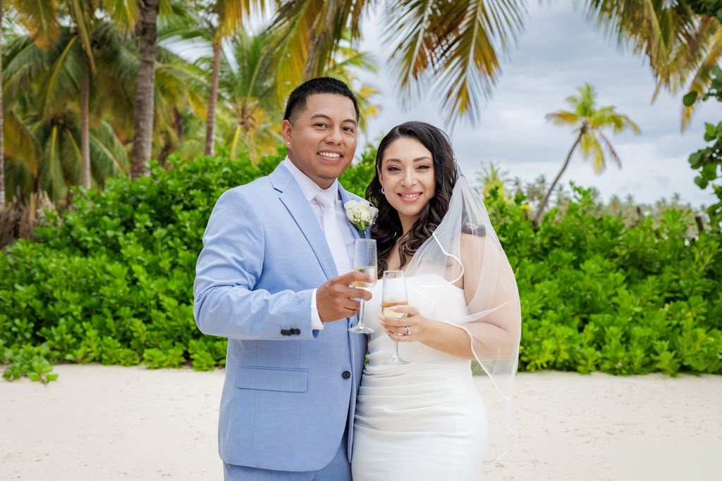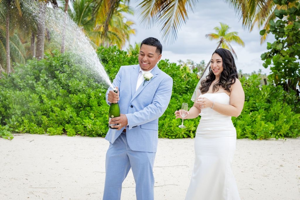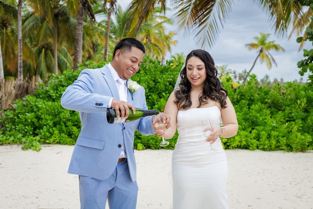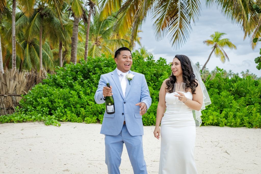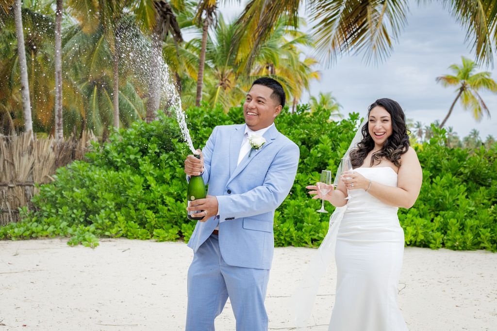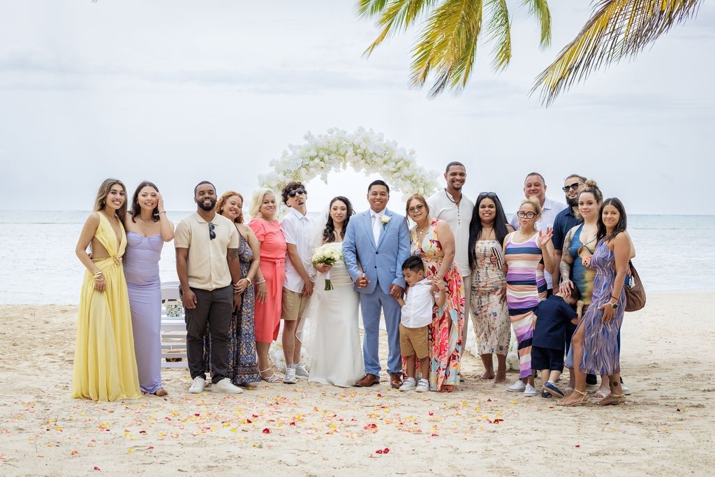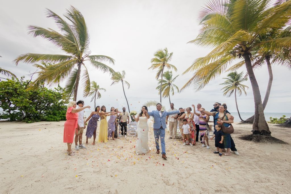 Anschließend erhob das Paar seine Gläser mit Champagner. Ihre Liebsten umgaben sie mit Lachen, Umarmungen und herzlichen Glückwünschen. Es war eine Szene voller Wärme und Glück. Außerdem ging die Sonne langsam über dem Karibischen Meer unter und tauchte ihren perfekten Tag in goldenes Licht.